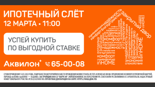 12 марта в 11 часов в офисе Группы Аквилон в Архангельске на ул. Попова, 14 (6-й этаж) пройдет «Ипотечный слет»*. Участие в мероприятии – бесплатное. Все подробности можно узнать уже сегодня по телефону 8 (8182) 60-40-30.