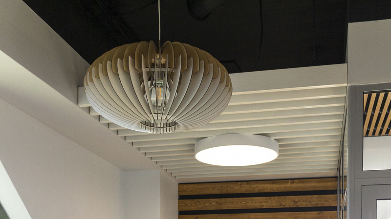 Высота помещения оказалась довольно значительной, поэтому выбрав черный оттенок для потолка удалось визуально расширить пространство, считает Евгений. С ним согласен и руководитель АНР «Факел» Сергей Долгобородов: цветовые пятна и разные типы потолочных конструкций зрительно выделяют различные функциональные зоны.