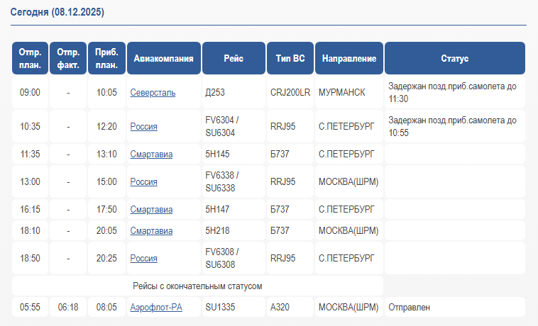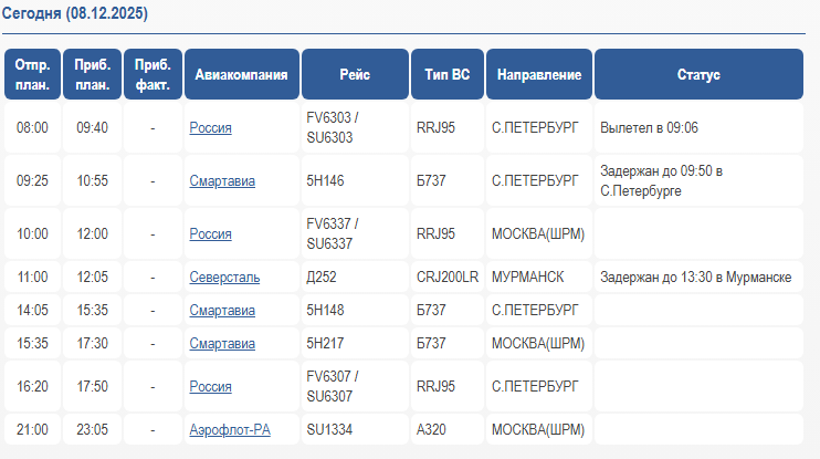Борт «Смартавии», который должен был отправиться в 09:25, оказался сдвинут на 09:50. Рейс «Северстали» из Мурманска задержан до 13:30.