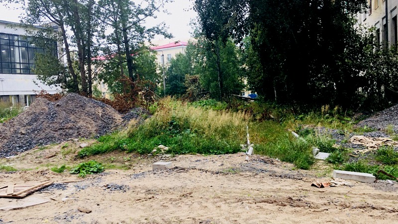 Однако до сих пор здание пустует. Не сдвинулось с места и благоустройство прилегающей территории: повсюду горы строительного мусора, а колодцы закрыты деревянными паллетами.