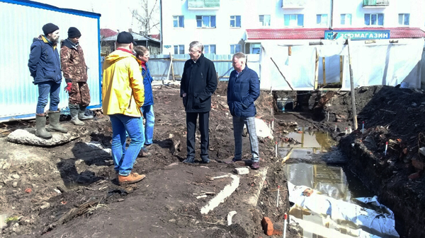 При проведении работ по перекладке телефонных кабелей «Ростелекома» в районе стройплощадки ЖК «Ривер Парк» в районе ул. Урицкого – Набережной Северной Двины, за пределами пятна застройки, обнаружены объекты, которые сейчас проходят идентификацию. По соглашению между группой «Аквилон» и Институтом археологии Российской Академии наук все земляные работы выполняются под наблюдением специалистов института.