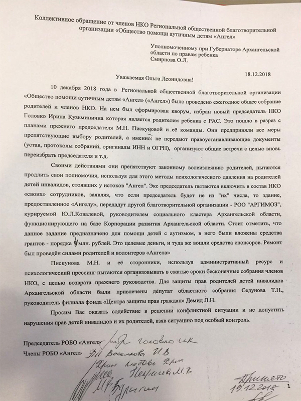 Сразу несколько участников организации «Ангел», включая её вновь избранного председателя, написали коллективное обращение к детскому омбудсмену с просьбой разобраться в конфликте с прежним руководством, парализовавшем работу НКО.