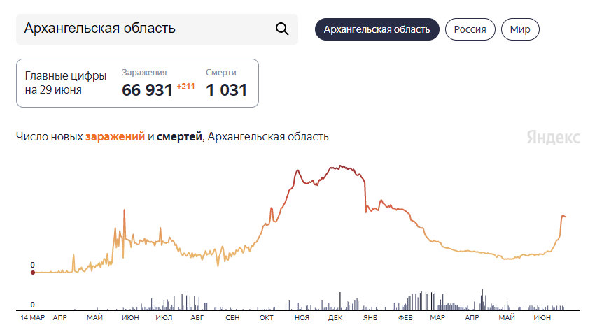 После пика, который был зафиксирован 26 июня (217 заболевших за сутки), суточная заболеваемость коронавирусом в регионе пошла на спад. 29 июня в Поморье выявлены 212 новых случаев ковида.