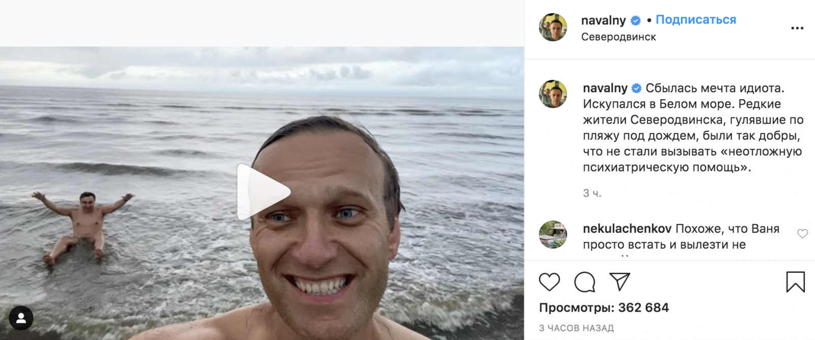 На своей странице в instagram Навальный сообщил, что оказывается у него была мечта - искупаться в Белом море. Мечта сбылась. Судя по кадрам, выложенным в соцсеть, подписчики увидели довольного жизнью политика.