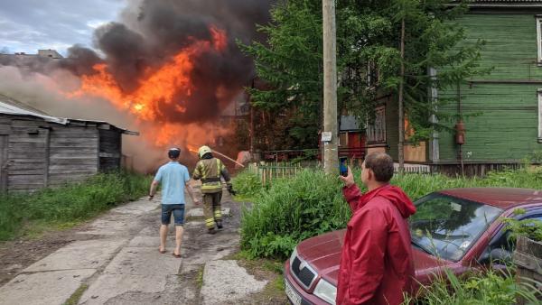 Пожар в хозяйственных постройках на площади две тысячи квадратных метров пришлось ликвидировать архангельским огнеборцам этим вечером. В связи с угрозой распространения огня из соседних домов были эвакуированы жильцы.