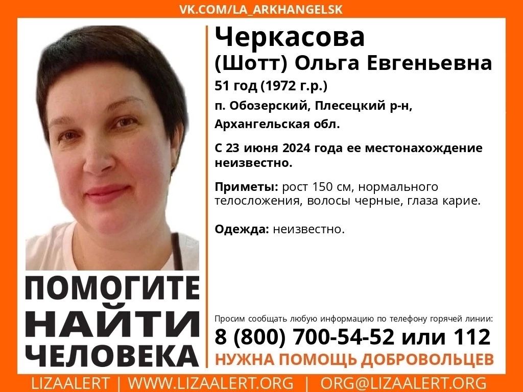 Об исчезновении Черкасовой (Шотт) Ольги Евгеньевны, 1972 года рождения, стало известно 24 июня 2024 года. Есть основания полагать, что она была одета: в костюм и кроссовки светлого цвета, разноцветный шарф, с собой черный рюкзак.