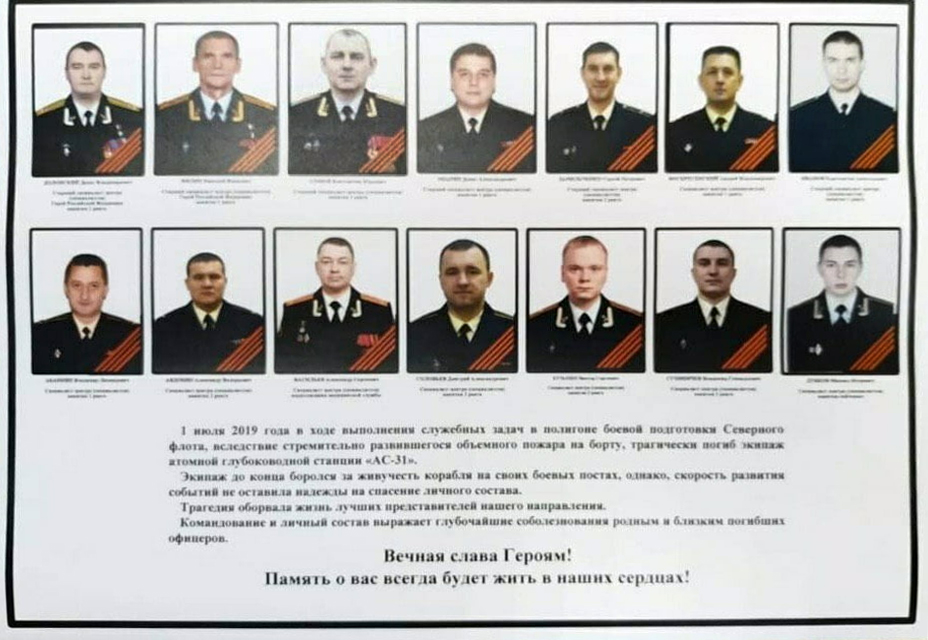 Позднее в сообществе «Военный осведомитель» появился некий поименный список моряков Северного флота, погибших при пожаре 1 июля на российской атомной глубоководной станции под бортовым номером АС-31. В публикации отмечается, что моряки-подводники погибли в ходе выполнения служебных задач в результате сильного пожара на борту.