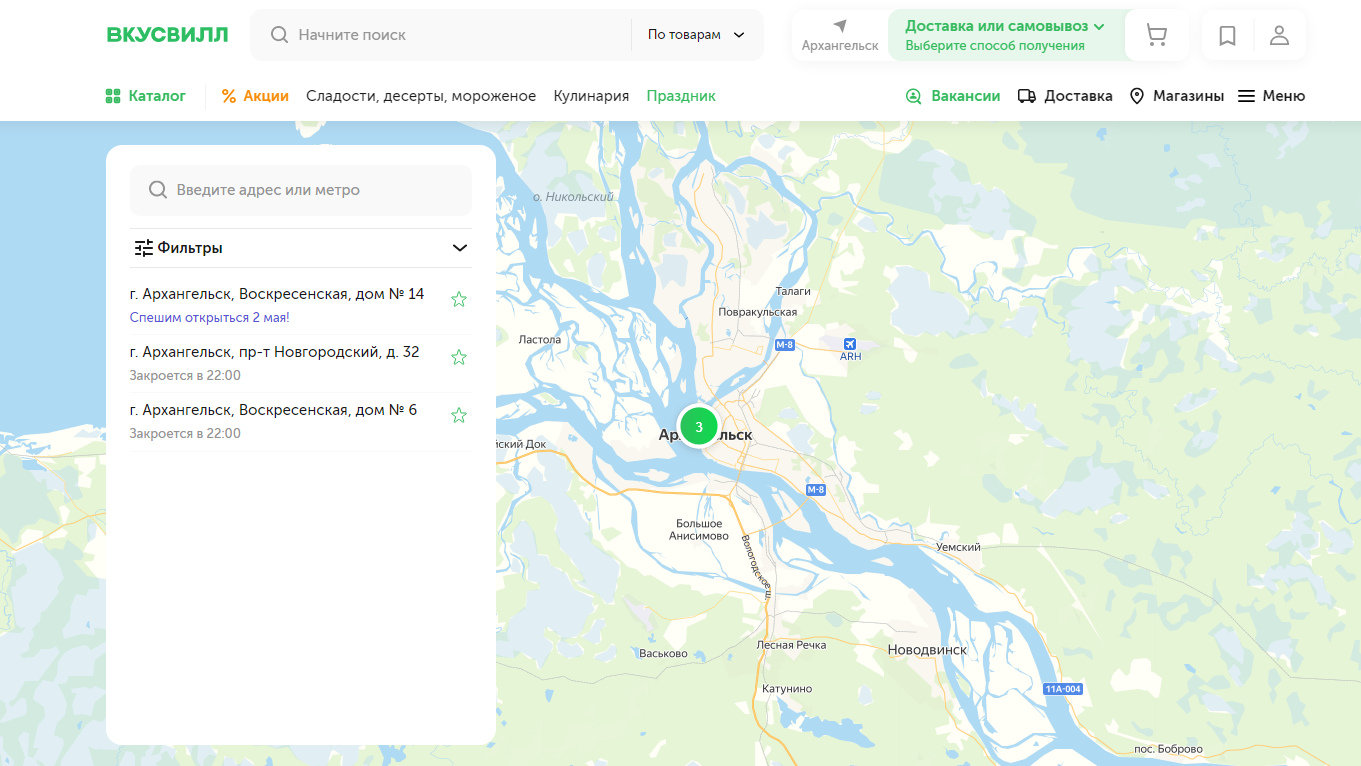 На официальном сайте компании «Вкусвилл» говорится об открытии 2 мая третьего магазина данной сети в Архангельске. Однако в пресс-службе ритейлера заявили, что пока в городе продолжат работу лишь две торговые точки.