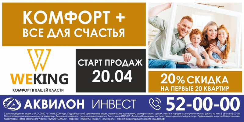 * Сроки проведения акции с 07.04.2020 по 30.04.2020 года. Подробности об организаторе акции, правилах ее проведения, размере скидок, сроках, месте и порядке их получения можно узнать по тел. 8 (8184) 52-00-00. Предложение ограничено количеством квартир. Денежный эквивалент скидки не выплачивается. Застройщик ООО СЗ «Аквилон Недвижимость». Многоквартирный жилой дом по ул. Орджоникидзе в городе Северодвинске. Кадастровый номер земельного участка: №29:28:103090:81. Перевод: «WEKING» (Викинг) - «мы король». Проектная декларация на сайте наш.дом.рф.