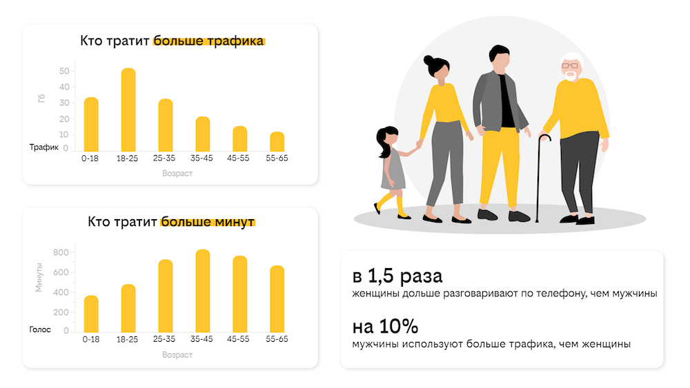 Абсолютным лидером по количеству потребляемого трафика является молодежь студенческого возраста: абоненты 18-25 лет в среднем скачивают за месяц в 2 раза больше трафика, чем другие клиенты. С возрастом количество потребляемого трафика снижается в разы: бабушки и дедушки потребляют в 4 раза меньше трафика, чем молодежь студенческого возраста, и в два раза меньше, чем их внуки.