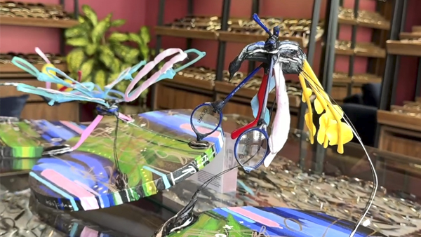 Главной особенностью коллаборации стал материал из которого художник сделал арт-объекты – это очковые оправы.