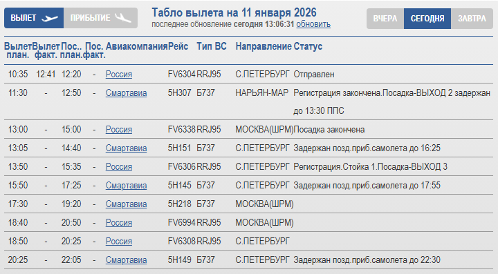 На прилете картина не менее напряженная. Самолет 5Н217 из Москвы задерживается в Шереметьево до 14:00, а рейс 5Н308 из Нарьян-Мара — до 15:40. Еще один петербургский рейс, 5Н148, отложен в Пулково до 20:20.