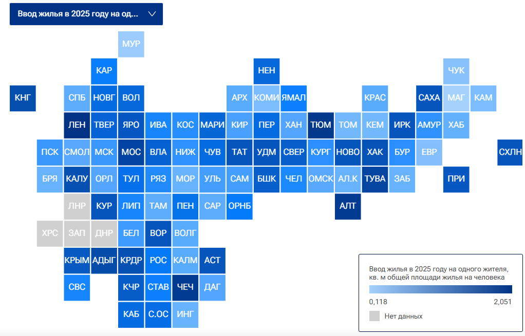 Разрыв между субъектами остается значительным: в целом по России ввод жилья варьируется от 0,12 до более чем 2 квадратных метров на человека. При этом в число отстающих традиционно попадают северные и дальневосточные территории с более сложными условиями строительства.