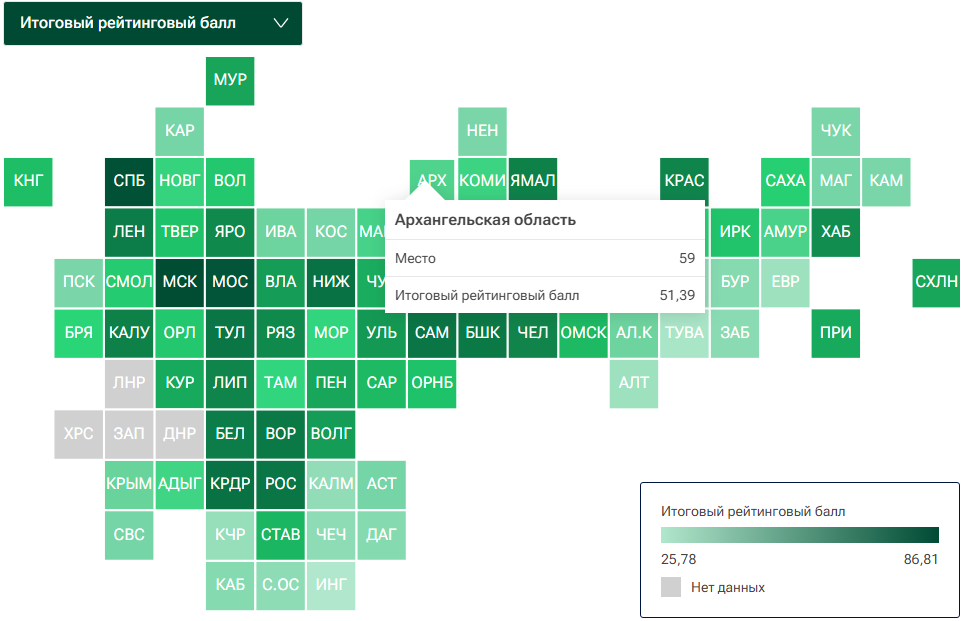 Совокупный рейтинговый балл Архангельской области составил 51,39 из 100 возможных, что позволило Поморью остаться в середине списка, но ниже прошлогодних позиций.