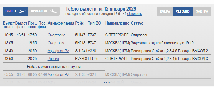 Архангельский аэропорт, как и несколькими днями ранее, вновь притормозил рейсы на столичные направления. Так, рейс 5Н218 авиакомпании «Смартавиа» в Москву (Шереметьево), запланированный на 18:05, был задержан из-за позднего прибытия самолета — вылет ожидается не раньше 19:10. Петербургский рейс 5Н147 этой же авиакомпании хоть и отправился, но тоже ушел с опозданием почти на сорок минут.