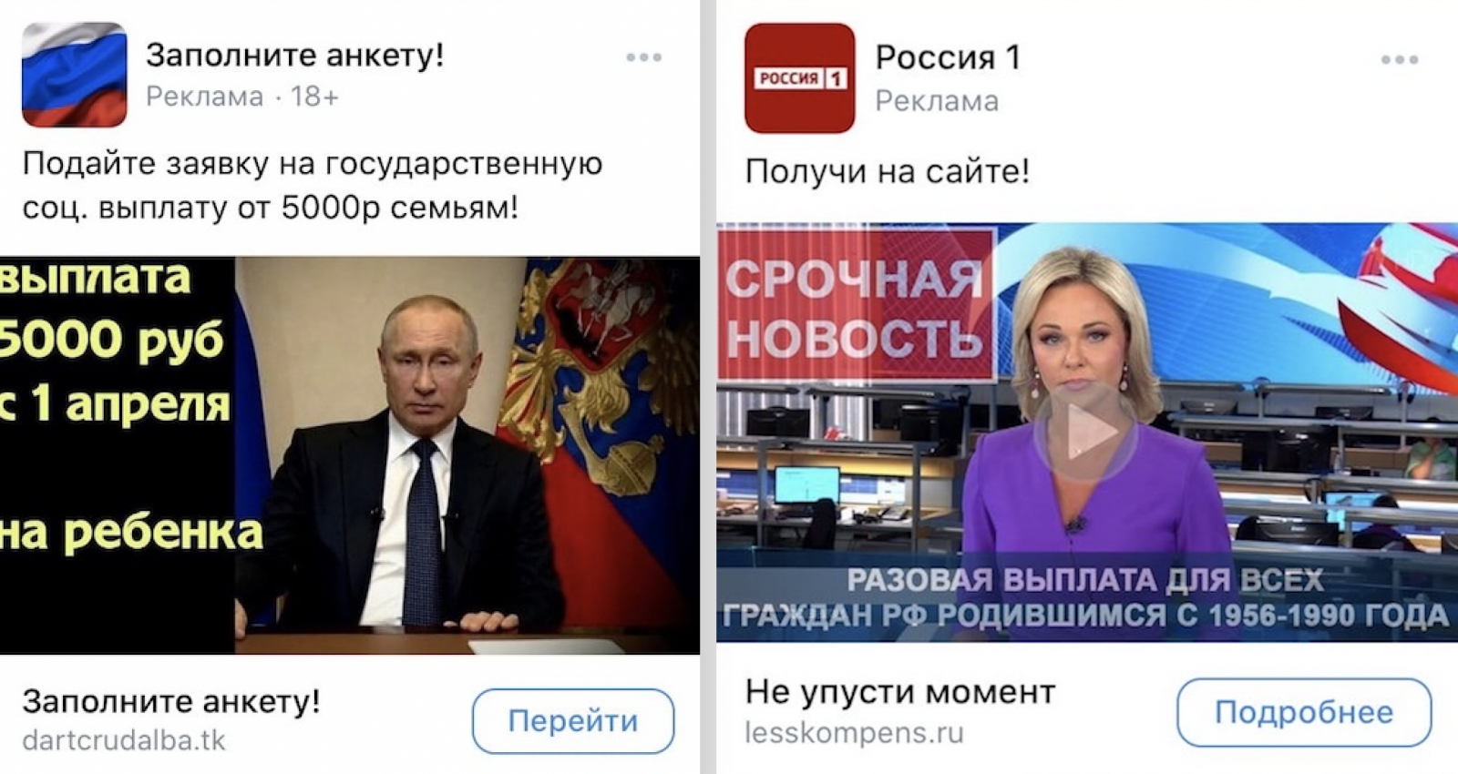 Второй, на наш взгляд, вопиющий случай выманивания денег у россиян зафиксирован в настоящий момент в социальной сети ВКонтакте. Используя образы президента России и кадры из эфира телеканалов «Первый» и «Россия 1», мошенники в наглую «рубят капусту» через внутреннюю рекламную сеть ВКонтакте. Каким образом админы ВК пропускают подобное, остается загадкой. Суть рекламы – получите свои выплаты, которые обещает государство прямо сейчас. Ранее мы уже писали о