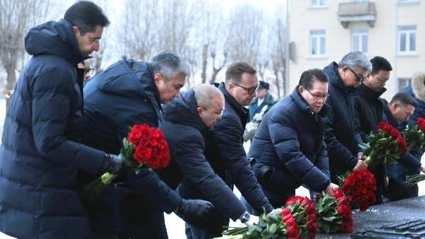 Первый день визита начался с торжественной церемонии возложения цветов к монументу «Воинам-северянам, павшим в годы Великой Отечественной войны», на площади Мира. В память о подвиге защитников Отечества дипломаты вместе с представителями регионального правительства и кадетами Губернаторского морского кадетского корпуса возложили цветы к Вечному огню.