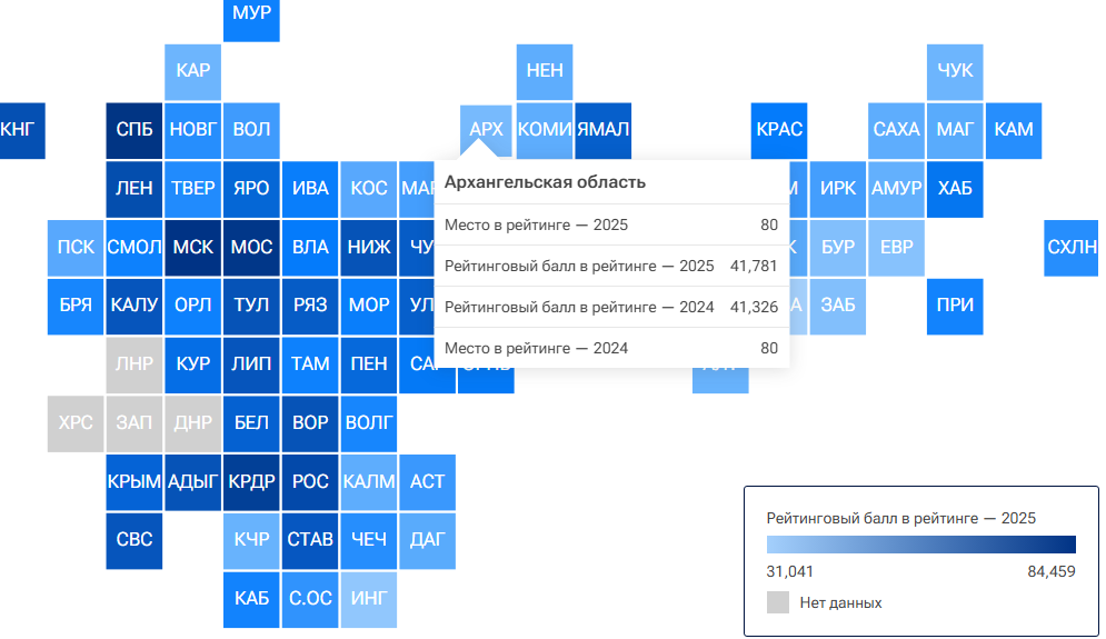 Поморье вновь оказалась в числе регионов-аутсайдеров по качеству жизни, заняв 80-е место. Несмотря на формальный рост рейтингового балла, позиции области за год ухудшились на фоне более динамичного развития других субъектов.