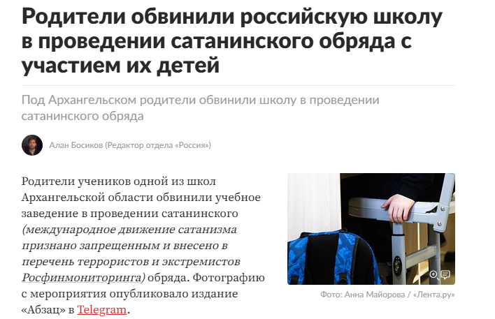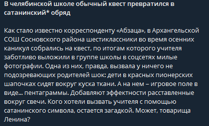 Сегодня утром сразу несколько федеральных изданий, включая «Царьград» и «Лента.ру», распространили новость о якобы проведении «сатанинского»* мероприятия в одной из школ Архангельской области. Источником информации стал Telegram-канал «Абзац», который сообщил, что «в Архангельской СОШ Сосновского района» шестиклассники участвовали в квесте, где игровое поле напоминало пентаграмму.