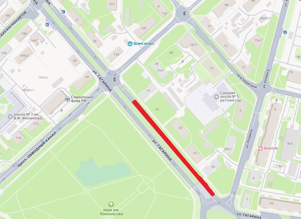 На время ремонта движение автобусов в сторону площади Предмостной будет организовано по следующему маршруту: улица Тимме — улица Гагарина — улица Розинга — проезд Бадигина — проспект Обводный канал — улица Гагарина, далее транспорт продолжит движение по действующим схемам.