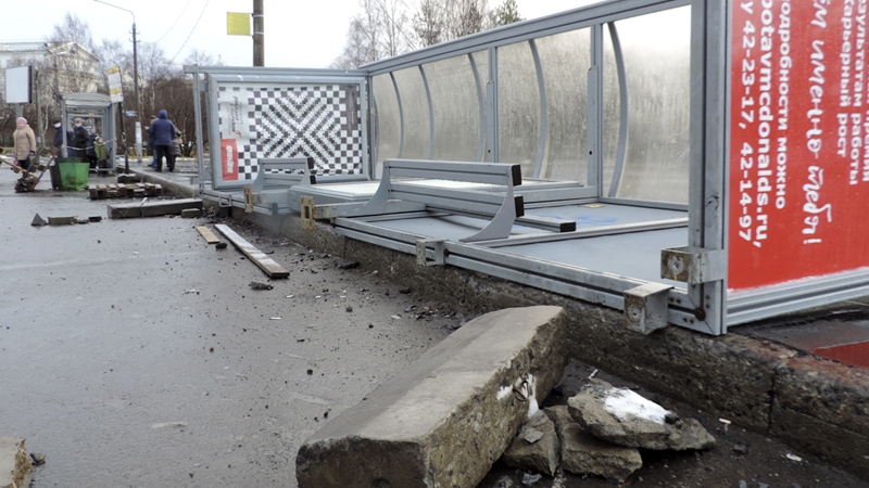 Вопросы к подрядчику возникли и у простых горожан, которые вынуждены наблюдать зятянувшийся хаос и разруху на близлежащей автобусной остановке, где в свое время за счет частных инвестиций архангельских рекламщиков был обустроен пункт ожидания транспорта. Сейчас место посадки и высадки пассажиров представляет собой настоящую полосу препятствий, больше похожую на зону боевых действий.