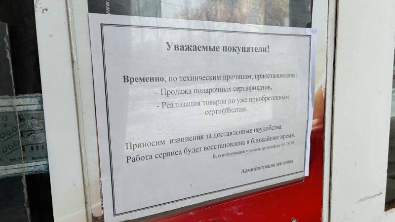 Одновременно на дверях размещено объявление о временной приостановке продажи и использования подарочных сертификатов — «по техническим причинам». Сроки возобновления сервиса при этом не уточняются.
