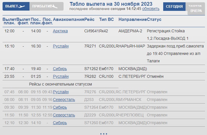 Судя по расписанию онлайн-табло международного аэропорта в Талагах, который накануне получил необходимые для осуществления деятельности документы от Росавиации, в 15:10 из Архангельска должен был вылететь самолет авикомпании «Руслайн» в Нарьян-Мар, но его задержали до 19:40.